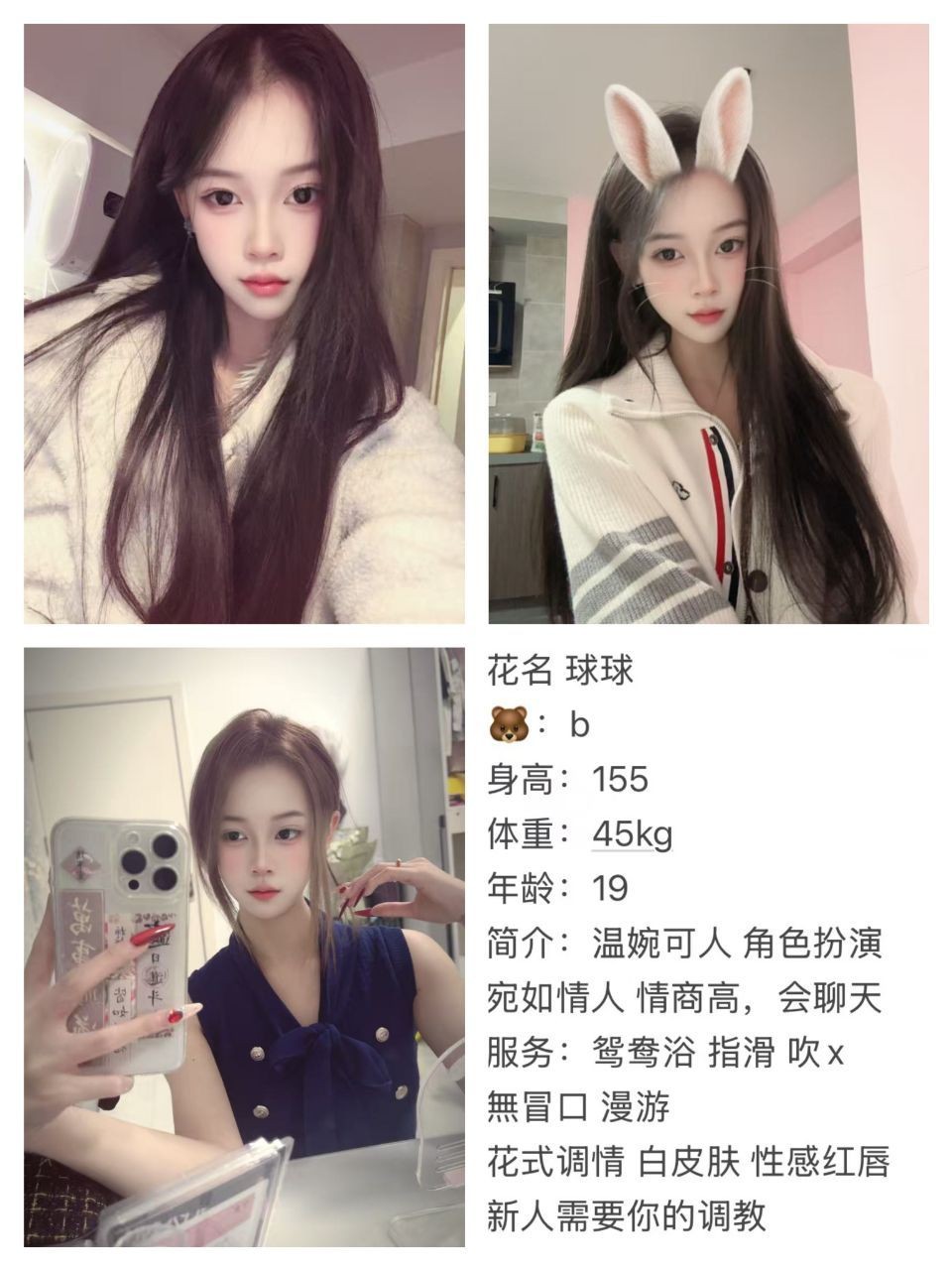 全套服务,69/互舔,爱爱,颜射,胸推,丝袜制服,口爆,等等